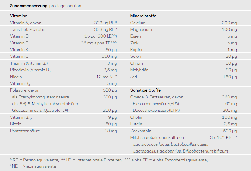 Die positive Wirkung stellt sich bei einer täglichen Aufnahme von 200 mg DHA, zusätzlich zur empfohlenen Tagesdosis an Omega-3-Fettsäuren von 250 mg DHA und EPA, ein. Zink trägt zu einer normalen Fruchtbarkeit und Fortpflanzung bei. Eisen trägt zu einer normalen Bildung von roten Blutkörperchen und Hämoglobin bei. Calcium, Magnesium, Zink, Eisen, Vitamin D, Vitamin B12 und Folsäure haben eine Funktion bei der Zellteilung. Vitamin C, Vitamin B6, Vitamin B12, Vitamin D, Folsäure, Eisen, Zink, Selen und Kupfer tragen zur normalen Funktion des Immunsystems bei. Calcium wird für die Erhaltung normaler Knochen benötigt. Vitamin C, Vitamin K, Vitamin D, sowie Zink und Magnesium tragen zur Erhaltung normaler Knochen bei. Zudem tragen Calcium und Magnesium zur normalen Muskelfunktion bei. Vitamin C, Vitamin B2, B6, B12, Folsäure, Niacin, Pantothensäure und Magnesium tragen zur Verringerung von Müdigkeit und Erschöpfung bei.